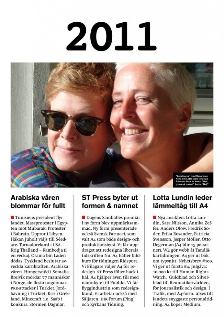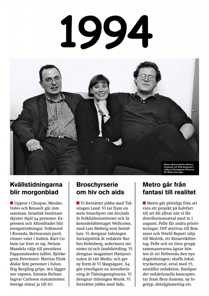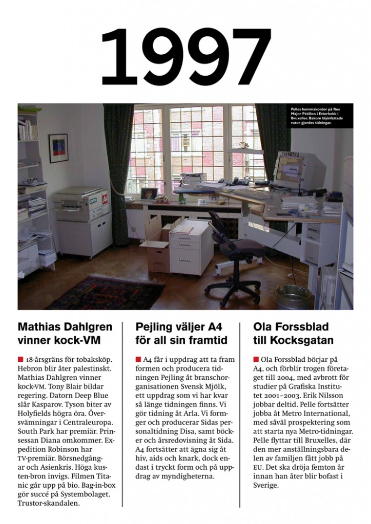 2017 firade A4 sina första 30 år som en av Stockholms ledande mediabyråer. Många tidningar har hittat sin nya form med A4:s hjälp. Många talanger har utvecklat sin begåvning hos oss. I serien med affischer nedan hittar du inte bara minnesvärda utdrag ur A4:s verksamhet, utan också historien om våra kunder – och avgörande händelser i omvärlden.